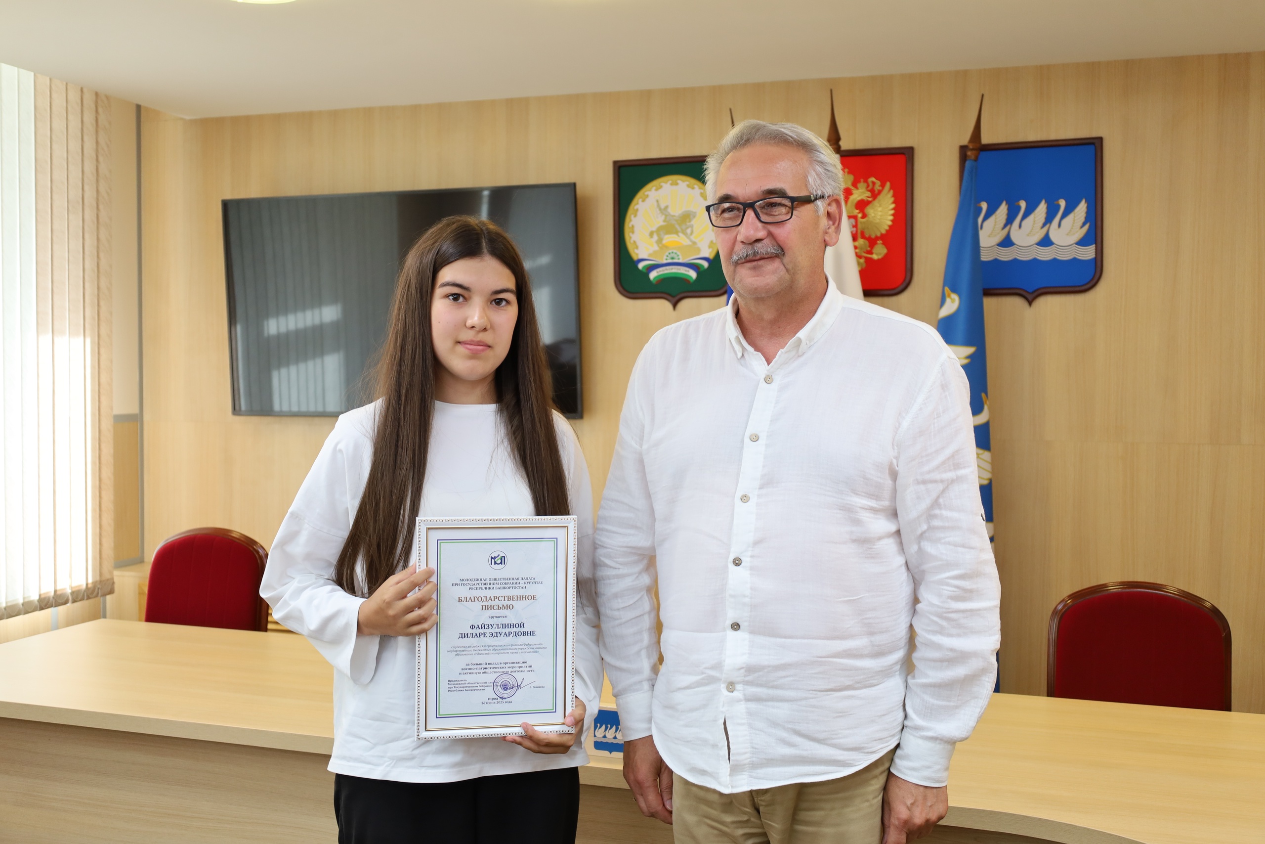 Молодые люди получили благодарственные письма за вклад в организацию мероприятий, посвящённых 80-летию Победы в Великой Отечественной войне, от Совета городского округа, Молодёжной общественной палаты при Государственном Собрании — Курултае Республики Башкортостан.